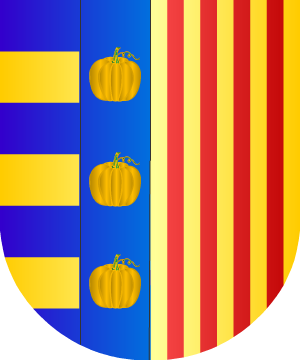 de azur, acompañada de dos cruces huecas, de gules, una arriba y otra