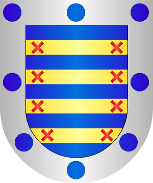 gules. 13.- Los originarios de Burgos y extendidos a Barcelona y Valencia, según Vicente de Cadenas, traen: En campo de azur, una cruz, recortada, de plata. 14.- Los de Burgos, según Vicente de Cadenas, usan: En campo de oro, un puente, de azur, mazonado de sable y en su centro, una torre, también de azur, acompañada a la diestra y la siniestra de un guerrero, de plata. 15.- Los originarios de Burgos, según Vicente de Cadenas, traen: En campo de oro, un jabalí, de sable, pasante. 16.- Los radicados en Madrid, según Vicente de Cadenas, traen: En campo de plata, un filete, de gules, puesto en orla. 17.- Otros, según Francisco Zazo y Rosillo, usan: En campo de plata, cuatro fajas de azur y en cada una dos sotueres de plata. 18.- Otros: En campo de plata, dos cubas, de su color, puestas en palo. 19.- Otros: En campo de oro, un monte, de sinople. 20.- Otros: En campo de oro, un anillo, de sable, 21.- En el expediente del Caballero de la Orden de Alcántara Francisco Antonio Godoy y Moral Peralta y Cuesta, natural de Berja (Almería), año 1854, constan las siguientes armas para los Cuesta: Escudo terciado en faja: 1º, un castillo y una torre acompañados de dos calderas en cada lado; 2º, dos castillos en faja, y 3º, dos lobos en faja, levantados. 22.- Los originarios de Penagos (Cantabria), siglo XVII, radicados en el mismo lugar hasta el XVIII, pasando a principios del XIX a La Encina de Cayón, posteriormente a Obregón de Villaescusa y en el siglo XX a Santillana del Mar (Cantabria), según Vicente de Cadenas, traen: En campo de azur, cuatro fajas, de oro, cargada cada una de dos aspas, de oro, puestas en los extremos de la faja. 23.- En la casa del Arzobispo Luis de Lastra y Cuesta, del lugar de Cubas, de la Junta de Ribamontán y Merindad de Trasmiera, constan: Una barra. En la parte superior tres estrellas y en la inferior tres fajas, La contrabanda de plata, la parte superior de azur. Complemento de información de estos linajes por cortesía de blasonari.net |