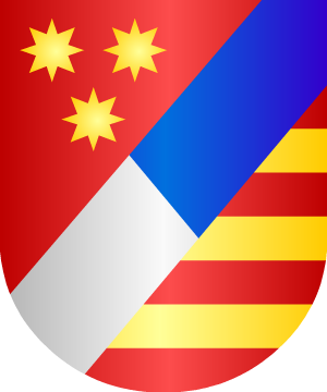 de oro: Escudo mantelado: 1º, en campo de azur, tres flores de lis de oro,