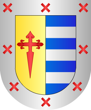 de oro: Escudo mantelado: 1º, en campo de azur, tres flores de lis de oro,