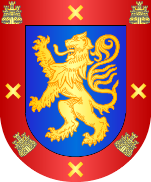 Radicado en Madrid. En azur, un león rampante de oro. Bordura de gules, con cuatro castillos y cuatro aspas de oro. (Ref.: CADENAS) |