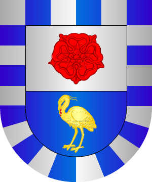 En gules, una caldera, de oro, gringolada de sinople. Bordura de plata, con ocho calderas de sable. (ref.: CADENAS). |