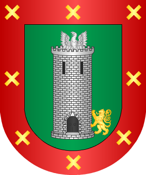 De sinople, à une tour d'argent, sommée d'une aigle issante du même et senestrée d'un lion d'or, rampant contre la tour, à la bordure de gueules, chargé de huit flanchis d'argent. (ref.: RIETSTAP). |
