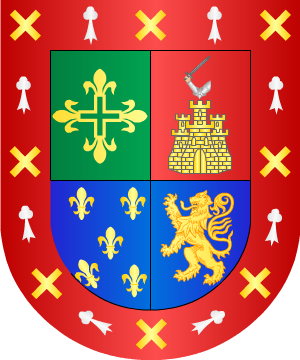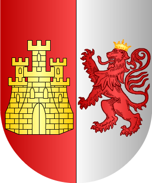 Armas En campo de gules un castillo de oro. Partido de plata, con un león rampante de gules, coronado de oro. "Parti: au 1, de gueules, à une tour sommée de trois tourelles d'or, celle du milieu plus élevée; [castillo] au 2, d'argent, au lion de gueules, couronné d'or". (Ref.: RIETSTAP), (ref.: GARCIA CARRAFA). (Garcia Carrafa omite coronado de oro). |