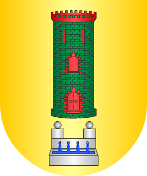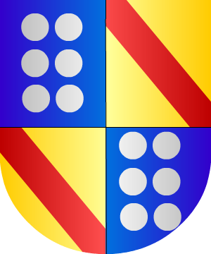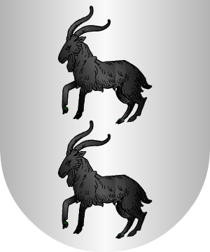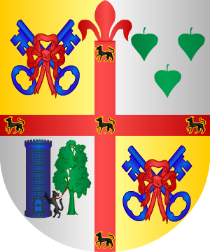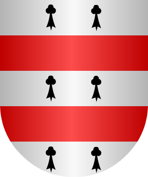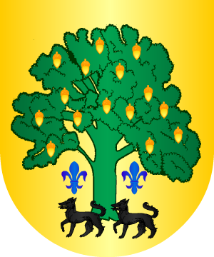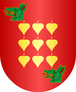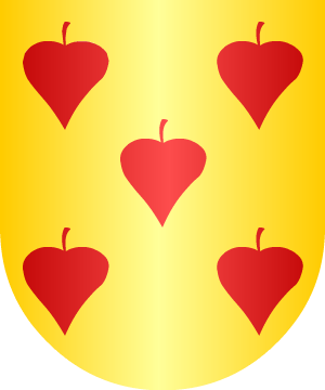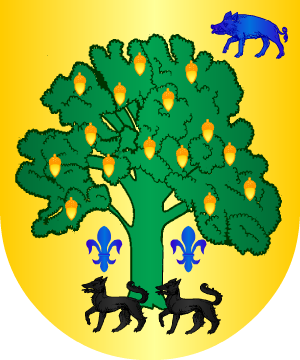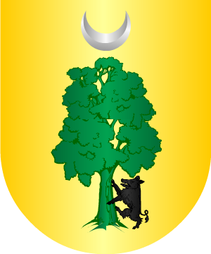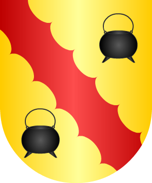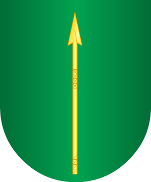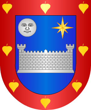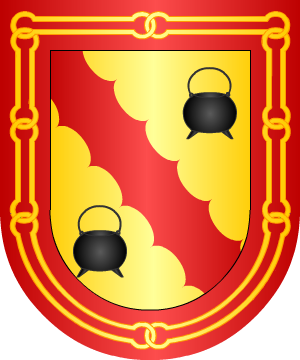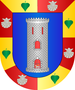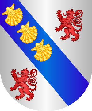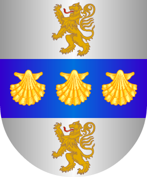 En campo de plata, una faja de azur, cargada de tres veneras de oro y acompañada