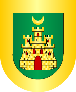 En oro, una cruz de sinople, puesta en jefe, y debajo de ella, seis roeles de azur, tres a cada lado. Bordura de gules, con dos escudetes colocados en los ángulos superiores; el de la derecha, de azur, con trece bezantes de oro, puestos de tres en tres y uno de non, y el de la izquierda, de oro, con trece bezantes (roeles) de azur, con la misma colocación; lleva además, la bordura ocho castillos y ocho aspas de oro, alternando, de forma que haya un castillo en la mitad del jefe y otro en la punta. (Ref.: CADENAS). |