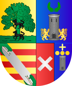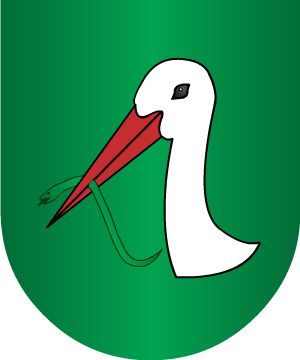 En sinople, la cabeza de una cigüeña, en su color, con una culebra en el pico, de sinople. (Ref.: CADENAS). |