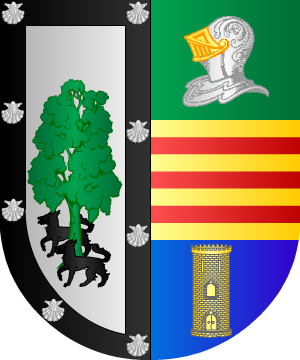 Escudo partido: 1.º, en campo de gules, un castillo de oro, y bordura de plata, con ocho escudetes de azur, cargados de una banda de plata cada uno, y 2.º, en campo de plata, tres fajas de azur, y bordura de ocho piezas, cuatro de oro, con un lobo de sable, y cuatro de gules, con una estrella de oro. (Ref.: ATIENZA), (ref.: GONZALEZ-DORIA), (ref.: CADENAS). |