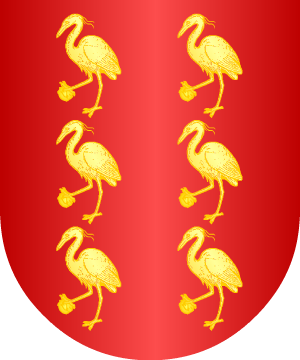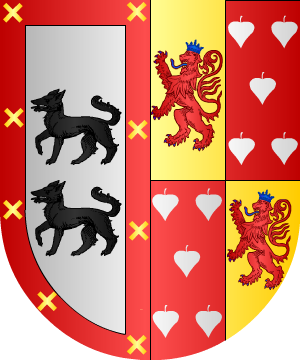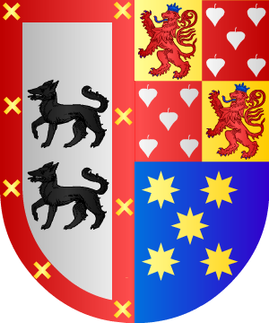 Écartelé: aux 1 et 4, d'argent, à deux loups de sable, l'un sur l'autre, à la bordure de gueules, ch. de huit flanchis d'or (Lopez); au 2, contre-écartelé: a. et d. d'or au lion de gueules, armé, lampassé et couronné d'azur (Suasso); b. et c. de gueules à cinq panelles d'argent, 2, 1 et 2, les tiges en haut (Hurtado de Mendoza); au 3, d'azur, à cinq étoiles d'or, 2, 1 et 2. (Ref.: da Fonseca). (ref.: RIETSTAP). |