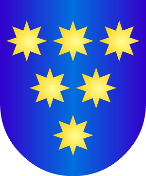 una banda, de gules, acompañada de ocho aspas, cuatro en jefe y cuatro