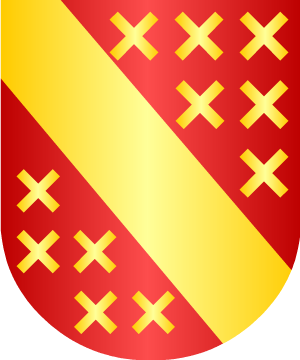 una banda, de gules, acompañada de ocho aspas, cuatro en jefe y cuatro