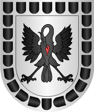 de dos flores de lis de oro, puestos en faja. Bordura de azur, con ocho castillos