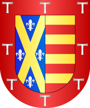 Partido: 1.º, en azur, un aspa, de oro, acompañada de cuatro lises, de plata; 2.º, fajado de oro y gules. Bordura de gules, con ocho taos, de plata. (Ref.: CADENAS) |