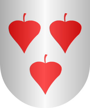 En campo de plata, una banda, de gules, cargada de tres rosas, de oro, y acompañada