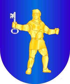 superada de una corona y un arco iris y debajo cinco dados, cuatro de gules